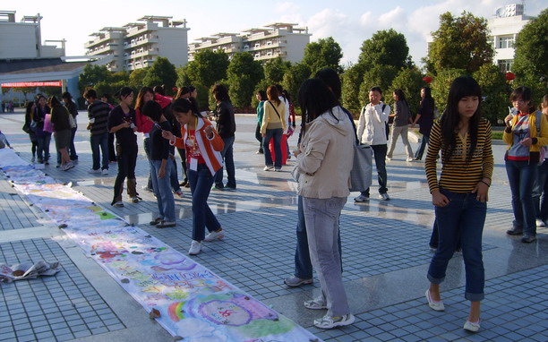 经过预选,共有19位画手入围以95周年校庆为题的决赛。选手们热情洋溢,挥洒自如,当场作画19幅。作品内容丰富,形式多样,连成一条长达20米的横幅长卷。横幅设计巧妙,构思新颖,有象征水大美好明天的金鸡报晓图,有寓意水大深厚文化底蕴的书海游乐图,也有独具一格的天才创新图及高耸入云的蛋糕庆生日图等等,给我们送上了一场丰厚的视觉盛宴。