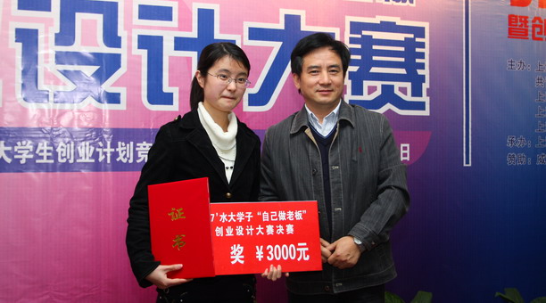 2007年12月6日下午,由校招毕办、团委、学生处、研究生部、宣传部共同主办,生命学院承办的2007水大学子“自己做老板”创业设计大赛决赛在我校培训中心举行。经过选手答辩、专家审评,由食品学院推选的kelphy饮料创意团队获得本次大赛金奖。校党委副书记、副校长黄晞建,市科技创业中心副主任韩明远、市教委学生处副处长田磊以及团市委、市学生联合会学校部副秘书长邵世志等领导出席仪式并致辞。
