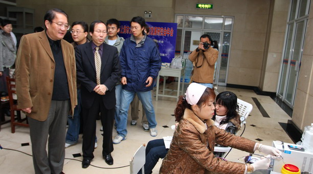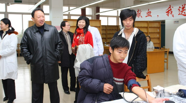 在献血工作现场,校党委书记叶骏、校长潘迎捷亲切看望慰问了无偿献血的师生们,与他们进行了交谈,对师生的奉献精神给予了高度的赞扬。