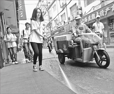 8月3日,来自同济大学、华东政法大学等高校的70余名学生参加了上海市大学生暑期绿化市容社会实践活动。除了实地体验绿化市容与环卫岗位的一线工作外,他们还将深入市绿化市容局、市水管处等单位,开展对地沟油、垃圾分类、立体绿化、新媒体运营等课题的研究并撰写调研报告。图为当日,上海海洋大学的学生在环卫工人的带领下,使用高压水枪清洗路面。