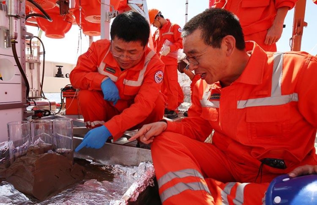 首席科学家许云平与海试总指挥崔维成讨论2号着陆器获得的马里亚纳海沟海底沉积物样品 图片来源:新华社