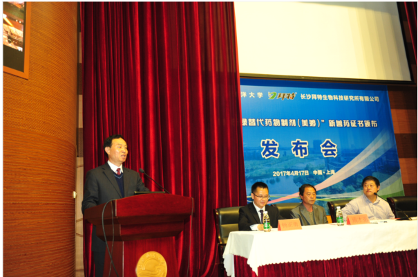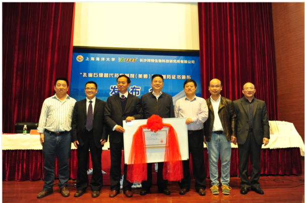 此后,上海海洋大学与长沙拜特生物科技研究所有限公司合作,在历经16项药理学实验、7项临床试验、8年生产性验证与应用、3年多轮每次由20余名行业专家的新药评审后,最终获得了世界上第一个专门用于水霉病治疗的孔雀石绿替代药物制剂。这个新兽药证书,也是自国务院《新兽药管理条例》(2004年3月24日国务院第404号令)发布后我国第一个关于水产用的有关化学的新兽药证书。