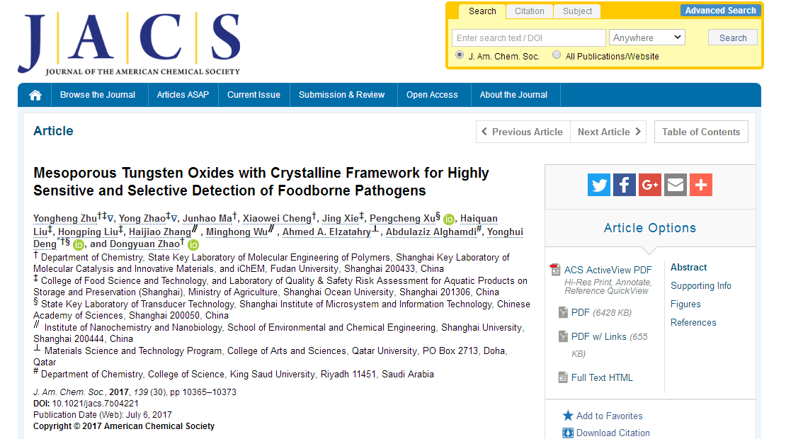 近日,美国化学会顶尖期刊《Journal of the American Chemical Society》(《美国化学会志》)在线发表上海海洋大学与复旦大学合作的研究论文《Mesoporous Tungsten Oxides with Crystalline Framework for Highly Sensitive and Selective Detection of Foodborne Pathogens》(《关于利用有序介孔三氧化钨快速检测食源性致病菌的研究》)(J. Am. Chem. Soc. 2017, 139, 10365−10373,IF=13.858)。我校食品学院朱永恒副教授和赵勇教授为论文的共同第一作者,复旦大学化学系邓勇辉教授为论文的通讯作者。该研究团队设计合成出一系列具有规整纳米孔道和高比表面积三氧化钨(WO3)半导体材料,并将其制作成气敏纳米器件,首次将该类半导体器件用于快速选择性地检测食源性致病菌。