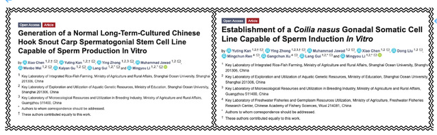 此次两项研究成果以“Generation of a Normal Long-Term-Cultured Chinese Hook Snout Carp Spermatogonial Stem Cell Line Capable of Sperm Production In Vitro”(链接: https://www.mdpi.com/2079-7737/11/7/1069 )和“Establishment of a Coilia nasus gonadal somatic cell line capable of sperm induction In Vitro”(链接:https://www.mdpi.com/2079-7737/11/7/1049 )为题发表于Biology上。此次研究由陈霄(硕士生)、阚宇婷(硕士生)和仲颖(博士后)等人完成,通讯作者为李名友教授和桂朗副教授。此次两项研究得到国家重点研发计划“蓝色粮仓科技创新”重点专项项目(批准号: 2018YFD0901205)和自然基金面上项目(批准号: 31672700)的资助。