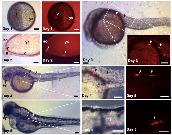研究表明,马口鱼精原干细胞在体内也具有多能性,将表达RFP的马口鱼精原干细胞移植到斑马鱼胚胎中发现,供体与斑马鱼胚胎发育形成了嵌合体并表现出正常的增殖和分化能力,能发育成来源于三个不同胚层的细胞。