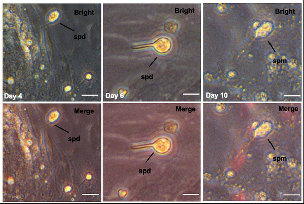 在本研究中,马口鱼精原干细胞系经过2年多的培养,仍具有二倍体核型,生长稳定,具有典型的精原干细胞基因表达模式。在体外培养条件下,马口鱼精原干细胞系可以诱导分化为精子和其他不同类型的体细胞。在体外培养条件下,马口鱼精原干细胞系在悬浮培养中形成拟胚体。在用视黄酸连续处理一周后,分化成神经元、星形胶质细胞和上皮细胞等多种体细胞,这表明马口鱼精原干细胞系在体外具有多能性。为了模拟体外减数分裂过程,团队将马口鱼精原干细胞系与马口鱼精巢细胞共培养。分别收集精巢细胞和表达红色荧光(RFP)的马口鱼精原干细胞,通过流式细胞进行染色体检查,发现细胞可以进入并完成减数分裂以产生单倍体产物。在共培养的第14天,观察到表达RFP的精子细胞,表明马口鱼精原干细胞逐渐诱导为未成熟精子细胞。共培养16天后,观察到表达RFP的马口鱼精原干细胞分化为更成熟的精子,尾部有轻微摆动行为。本研究验证了在合适的诱导条件下,马口鱼精原干细胞可以诱导产生精子细胞。
