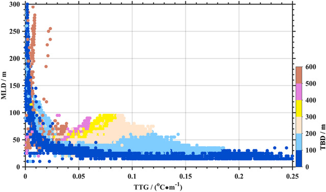 图2 利用GDCSM_Argo绘制的全球海洋气候态表层声速(上图)和温跃层参数关系(下图)分布(MLD:混合层深度;TBD:温跃层下界深度;TTG:温跃层梯度)