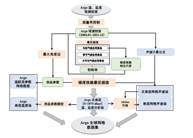 上海海洋大学海洋科学学院东海生境演变与渔业资源创新团队,联合自然资源部第二海洋研究所研究人员,利用梯度依赖最优插值方法研发的GDCSM_Argo数据集(图1),包含了全球海洋从海面到1975米水深范围内的海水温度和盐度,以及声速、混合层深度、温跃层下界深度和温跃层强度等物理海洋环境要素,其水平分辨率为1°×1°,垂向为0-1975米水深范围内共58层,时间范围为2004~2021年、分辨率为月,预计每半年更新一次。