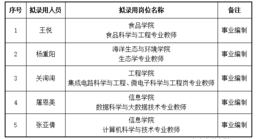 根据《上海海洋大学公开招聘事业编制人员管理办法(试行)》(沪海洋人〔2018〕11号)等文件精神,按照学校招聘计划,经综合考察、学校研究审定,现将近期拟录用人员名单予以公示。