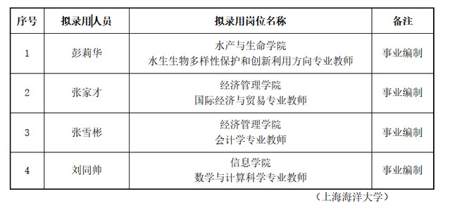 根据《上海海洋大学公开招聘事业编制人员管理办法(试行)》(沪海洋人〔2018〕11号)等文件精神,按照学校招聘计划,经综合考察、学校研究审定,现将近期拟录用人员名单予以公示。