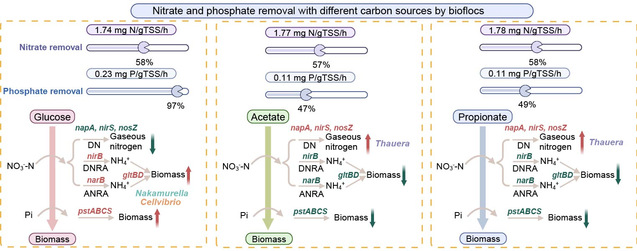 课题组还发现了不同碳源会诱导不同的氮、磷转化路径:葡萄糖更有利于生物絮团通过异养同化实现同步脱氮除磷,乙酸盐和丙酸盐则通过诱导生物絮团进行好氧反硝化过程,降低了同化效率进而降低了磷酸盐去除效率。