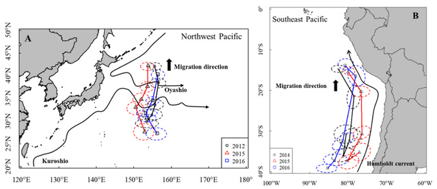 图1 基于经纬度重心的不同年份柔鱼(A)和茎柔鱼(B)的洄游路线