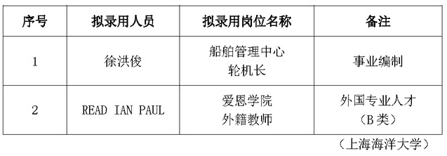 根据《上海海洋大学公开招聘事业编制人员管理办法(试行)》(沪海洋人〔2018〕11号)和《上海海洋大学外籍教师管理办法(试行)》(沪海洋人〔2019〕11号)等文件精神,按照学校招聘程序,经综合考察、学校研究审定,现将近期拟录用人员名单予以公示。