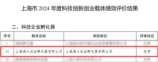 近日,2024年度上海市科技创新创业载体评价结果公示,上海海洋大学国家大学科技园(以下简称科技园)运营单位上海海大创业孵化器有限公司在此次评价中首次获评“优秀”。这一荣誉的获得,标志着上海海大创业孵化器有限公司在科技创新创业领域取得的显著成效和卓越贡献,得到了业界的广泛认可和高度评价。