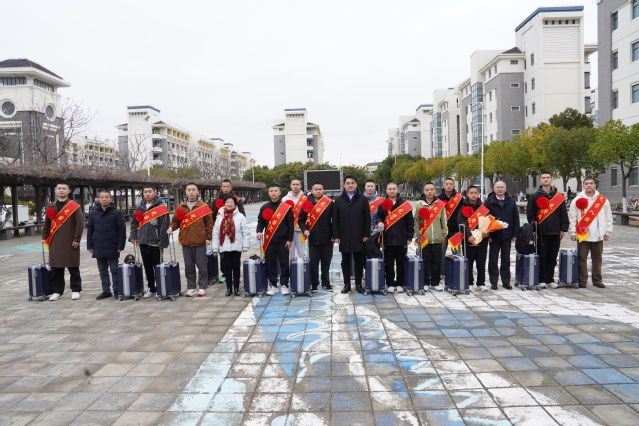“八一社”学生身着戎装,分列两排向即将踏入军营的学子们行礼致敬。本次应征青年中有三名学生是学校龙舟队成员,全体龙舟队队员们抬着龙舟,迈着整齐的步伐,喊着口号将坐在龙舟上的队友依依不舍地送上大巴。在老师的期待、家长的嘱托、同学的不舍中,14名学生向在场的所有人挥手惜别,奔向保家卫国的全新人生。