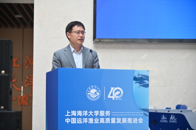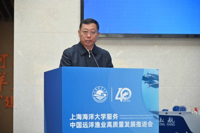 张显良致辞,他表示中国远洋渔业正面临着新的机遇和挑战。随着全球海洋经济的快速发展和国际渔业资源竞争的加剧,希望上海海洋大学以更高的站位、更宽的视野、更大的格局推动远洋渔业的发展。