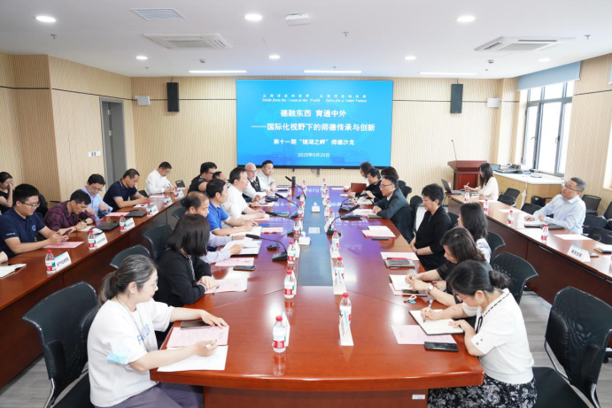 师德师风建设工作是凝心铸魂、立德树人的基础性工程,今年以来,学校深入开展师德师风建设强化行动,各二级学院结合学科专业特色,紧跟时代发展形势和社会热点,开展各类师德主题活动。5月20日下午,学校在文科楼B910会议室,举行“德融东西,育通中外——国际化视野下的师德传承与创新”第十一期师德沙龙活动。校党委副书记潘燕出席活动并讲话。教师工作委员会成员部门负责人、二级党组织书记、教师代表、学生代表等70余人参加本次活动,活动由党委教师工作部部长李柏林主持。