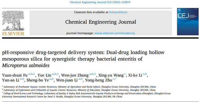 近日,国际知名期刊《Chemical Engineering Journal》在线发表了上海海洋大学纳米水产交叉学科领域的研究论文《pH-responsive drug-targeted delivery system: Dual-drug loading hollow mesoporous silica for synergistic therapy bacterial enteritis of Micropterus salmoides》(Chem. Eng. J. 515 (2025), 163819, IF=13.4)。上海海洋大学水产与生命学院“上海市水生生物多样性保护和利用重点创新团队”付元帅副教授及其硕士研究生为该论文共同第一作者,上海海洋大学食品学院“上海海洋大学食品与健康国际联合研究中心”朱永恒教授为论文通讯作者。该研究团队融合纳米、生物、化学、水产领域的优势,创新性地构建了一种pH响应型双药物负载中空介孔硅纳米系统,并首次成功应用于水产疾病治疗领域,通过协同递送抗菌药物(恩诺沙星)与天然抗氧化剂(虾青素),有效解决了水产动物细菌性疾病治疗中药物靶向性差、药物利用度低等关键难题,为水产病害防控提供了新策略。