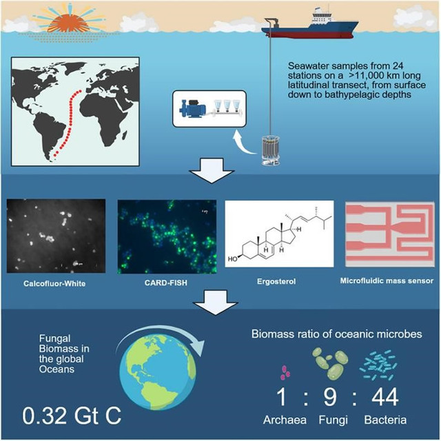 近日,上海海洋大学科研团队在国际顶级期刊《细胞》(Cell)发表的研究成果,揭示真菌是海洋碳循环中被长期忽视的“关键角色”。这项由海洋科学与生态环境学院费德里科·巴尔塔 (Federico Baltar)教授和博士后伊娃·布雷耶(Eva Breyer)领衔的研究,其采样区域横跨大西洋,从北纬40°到南纬50°长达1.1万公里。该研究首次精确量化了海洋真菌的碳储存能力,证实真菌对全球海洋碳循环的贡献远超古菌,从而颠覆了细菌和古菌是海洋碳循环主要推手的传统观点。