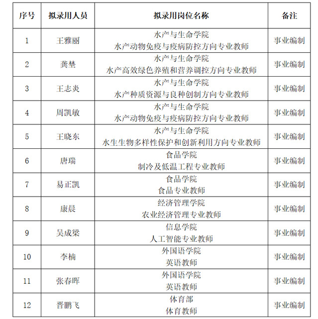 根据《上海海洋大学公开招聘事业编制人员管理办法(试行)》(沪海洋人〔2018〕11号)等文件精神,按照学校招聘程序,经综合考察、学校研究审定,现将近期拟录用人员名单予以公示。