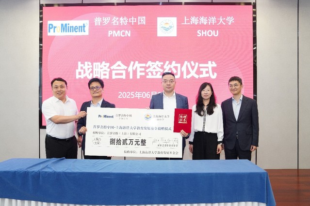 普罗名特(上海)有限公司与学校完成捐赠签约,向学校捐赠82万元,设立普罗名特奖学金。段颖泽向学校捐赠奖学金支票,上海海洋大学社会协同与校友事务处副处长张宇峰向普罗名特(上海)有限公司颁发《捐赠证书》。同时,双方签订《深海装备联合开发》技术合作协议,普罗名特(上海)有限公司出资68万元,由上海海洋大学工程学院相关科研团队承担深海计量泵、深海多参数水质监测仪的研制工作。