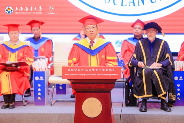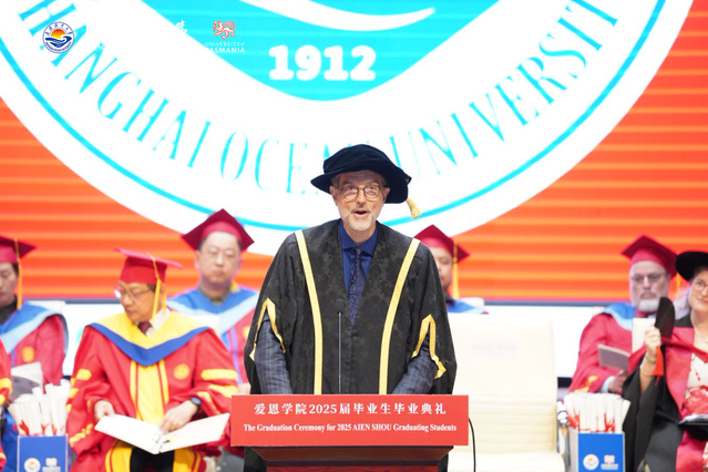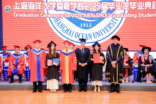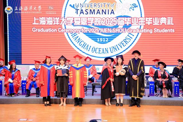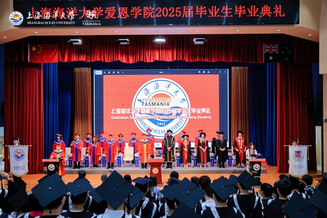 6月11日上午,上海海洋大学与塔斯马尼亚大学2025届爱恩学院毕业典礼暨学位授予仪式在大学生活动中心举行。上海海洋大学校长万荣、副校长江敏、教务处处长胡庆松、校团委书记陆烨、爱恩学院党委书记孙礼仕、爱恩学院院长王娜,塔斯马尼亚大学校长鲁弗斯·布莱克(Rufus Black)、学术委员会副主席艾琳• 勒雷尔(Erin Roehrer)、国际学院院长梅兰妮·布莱恩特(Melanie Bryant)、商业经济学院院长马克·伯尔斯(Mark Bowles)、信息通讯技术学院高级讲师马修·斯普林格(Matthew Springer)出席典礼。典礼由江敏主持。