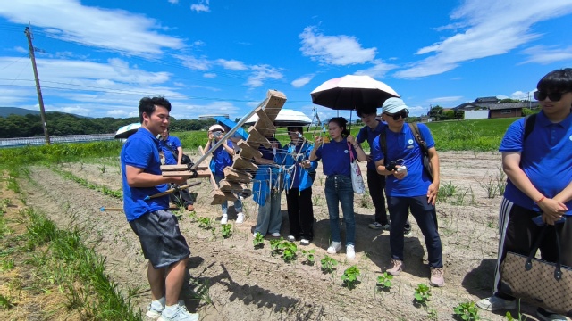本次海外实践课程将“课堂”设置在生态农场第一线,抛弃传统的走马观花,转向深度参与。在实训过程中,学生不畏38度的高温酷暑,在烈日下亲手操作设备。振荡除草犁,这是农场主古野隆雄博士改良的一种体现生态理念的行间除草机器,它不仅对旱田水稻非常有效,而且对各种蔬菜、小麦、玉米等作物也同样有效。徐宇航举起除草犁,俯身操作,通过观察发现,改装后的工作头可以有效深入10厘米根部,除草效率提升70%。