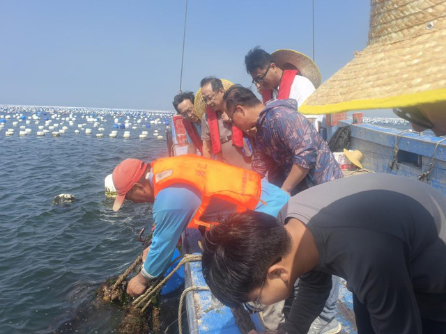 8月23日,万荣校长、高忠文教授与服务团专家不顾烈日酷暑,乘渔船前往马鞍列岛国家级海洋牧场示范区及其周边海域,实地考察厚壳贻贝三倍体稚贝的海上生长情况。服务团详细了解了三倍体稚贝包苗情况以及生长状态,并针对养殖技术难题提供了现场指导和建议。万荣、高忠文与服务团专家同养殖户、企业代表及嵊泗县海洋经济发展局、枸杞乡渔农业发展办公室等当地管理部门负责人深入交流,共同探讨了三倍体贻贝的养殖、未来潜力以及嵊泗贻贝种质繁育产业的整体发展方向。