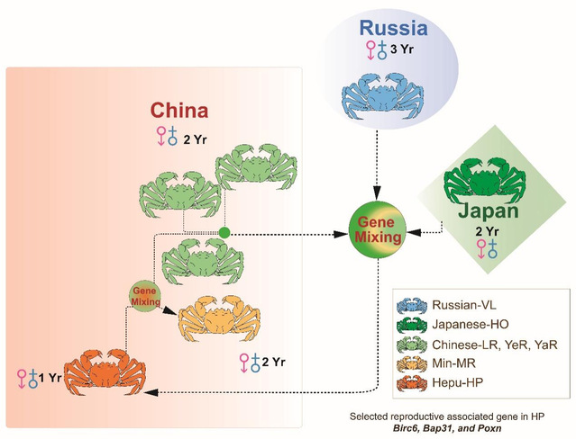 本世纪以来,上海海洋大学联合国内外机构收集了绒螯蟹属7个不同地理种群,共139个个体,综合表型性状评价与群体基因组学解析等手段,揭秘了绒螯蟹属的“家族系谱”。研究发现,中华绒螯蟹与日本绒螯蟹约14.84百万年前分化为两个物种,随后在绒螯蟹属的演化过程中,两种绒螯蟹向南北两个方向的扩散和杂交,分别产生了南方合浦绒螯蟹和北方的北亚绒螯蟹(主要分布于俄罗斯海参崴水域)两个杂交群体。其中合浦绒螯蟹在杂交后长期独立演化,形成了与亲本明显差异的表型和遗传特征,以及繁殖特点(如一年性成熟),是通过杂交形成的新物种。此外,分布于不同地理区域的群体演化出与当地生态环境高度适配的独特基因组结构与生态环境适应策略。