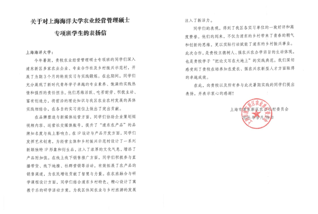 近日,上海市浦东新区农业农村委员会致信上海海洋大学,对学校农业经营管理硕士专项班学生在暑期实践中的优异表现给予高度评价和衷心感谢。