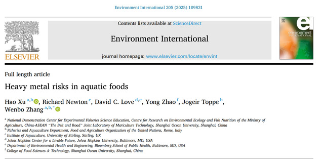 近日,我校联合国粮农组织(FAO)实习生、水产与生命学院硕士生徐昊与FAO渔业及水产养殖业司渔业官员Jogeir Toppe、约翰霍普金斯大学、斯特灵大学学者及我校食品学院赵勇教授合作,在环境科学领域顶级期刊Environment International(中科院一区 TOP,影响因子 9.7)发表题为Heavy metal risks in aquatic foods的研究型论文。该研究创新性地在全球、国家和消费者三个维度量化水产品重金属危害与风险,并结合水产品消费收益进行对比分析,最终明确全球层面水产品消费安全限值远高于当前全球平均消费量,为推动水产品可持续消费提供了关键理论支撑与数据依据。论文以上海海洋大学为第一单位,水产与生命学院张文博副教授担任通讯作者。