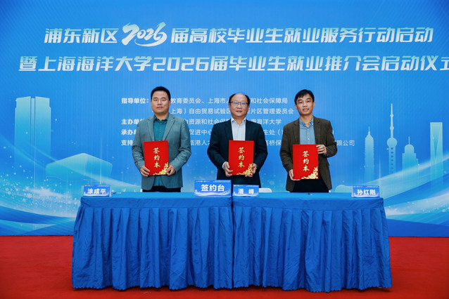 潘峰、孙红刚、涂成平分别代表浦东新区就业促进中心、上海海洋大学、有课互联(上海)科技有限公司共同签订“政校企实习见习就业一体化合作协议”。深化“政、地、校、企就业协同育人”平台建设,在人才培养、实习实践、就业输送等环节落实落细。