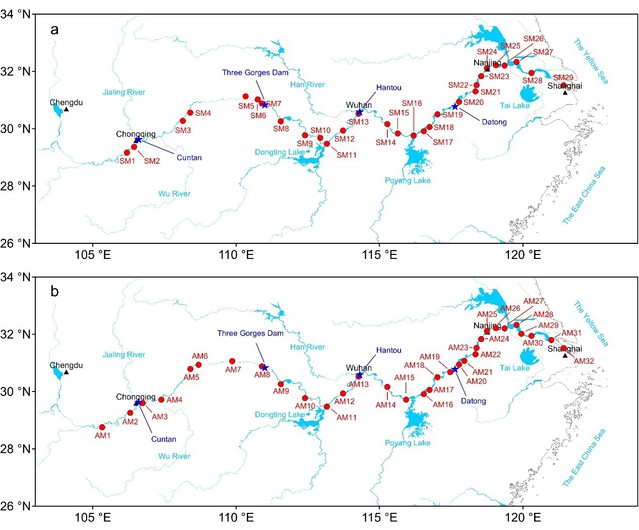 三峡水库在雨季来临前便进入年度消落期。截至5月底,水库水位从158米降至150米。消落期内,水库向下游下泄的总水量达64亿立方米,占寸滩水文站4月总径流量的44%。与之相对,该水库于同年9月启动季节性蓄水进程,至10月底完成蓄水,累计蓄水总量达138亿立方米,占寸滩水文站十月径流量的43%。在消落期(如4月),水库下泄的水体含沙量极低,这种水体侵蚀能力显著增强,常被称为“饥饿水”,可能加剧对下游河岸与河床的冲刷作用。相反,在蓄水期(如10月),水库会拦截上游大部分来水与泥沙,导致上游颗粒物对下游悬浮泥沙的贡献占比大幅降低。此阶段下游水体中的颗粒物,主要来源于流域内的本地源,例如强降雨引发的水土流失。