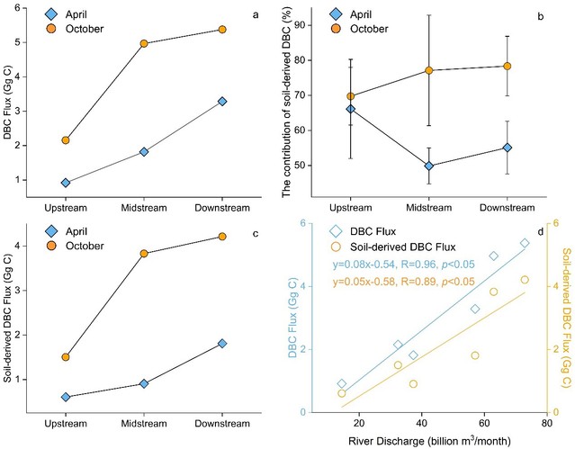图4:(a)DBC的通量,(b)土壤来源DBC的贡献,(c)土壤来源DBC的通量,(d)河流径流量DBC及土壤来源DBC通量之间的关系。