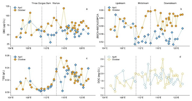 溶解态黑碳(DBC)是溶解有机碳中一种特殊的、富碳贫氢组分,主要来源于有机物质的不完全燃烧。由于具有极强的抗降解性,它被视为地球上的长期碳库。了解DBC在河流系统中的迁移和转化,是精准评估全球碳循环的关键。上海海洋大学海洋科学与生态环境学院林田教授团队揭示了长江干流DBC在雨季前后的空间分布和凝结度特征,计算长江DBC的年输出通量,指出流域内土壤的侵蚀是长江输出DBC的主要来源,三峡水库的“汛前消落放水,汛末抢蓄至满”的年度调度模式加剧下游土壤DBC向河口输出。研究结果对于认识DBC在河流系统中的迁移和转化、全球大型河流DBC来源至关重要。