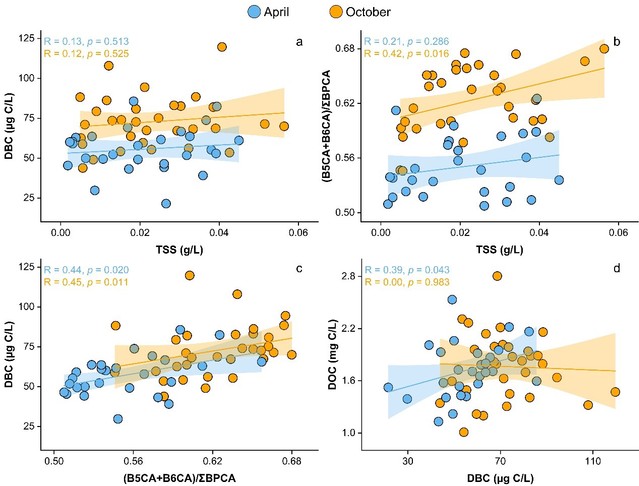 图3:(a)DBC浓度与TSS的关系;(b)DBC凝结度与TSS的关系;(c)DBC与DBC凝结度的关系,(d)DOC浓度与DBC浓度的关系。