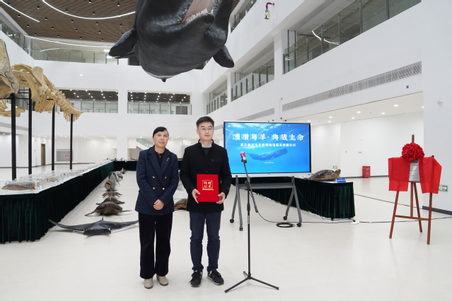 校党委副书记、校长胡炜(右)与校党委副书记、副校长夏雅敏(左)为抹香鲸标本档案揭幕