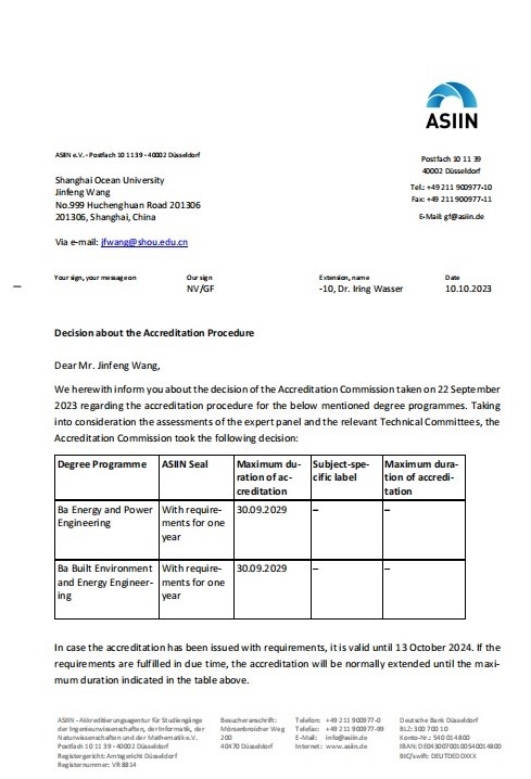 Recently, the German Accreditation Agency for Study Programs in Engineering, Informatics, Natural Sciences and Mathematics(ASIIN), a Europe-based professional accreditation agency, issued a notice stating that: two programs of the College of Food Science and Technology of Shanghai Ocean University (SHOU), i.e., Energy and Power Engineering and Built Environment and Energy Engineering, both passed ASIIN Accreditation on October10, 2023.