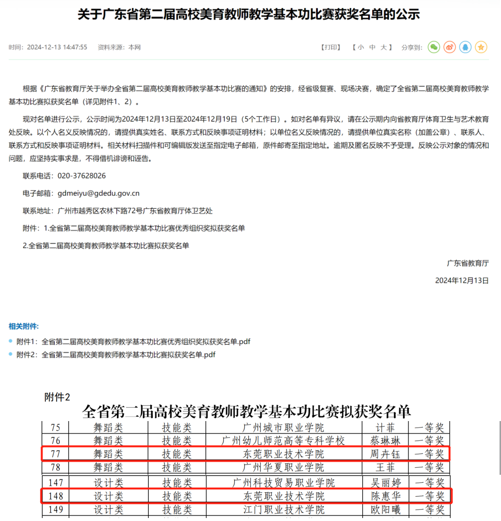 12月13日,广东省教育厅对广东省第二届高校美育教师教学基本功比赛获奖名单进行了公示。我校教师表现优异,脱颖而出,喜获佳绩。