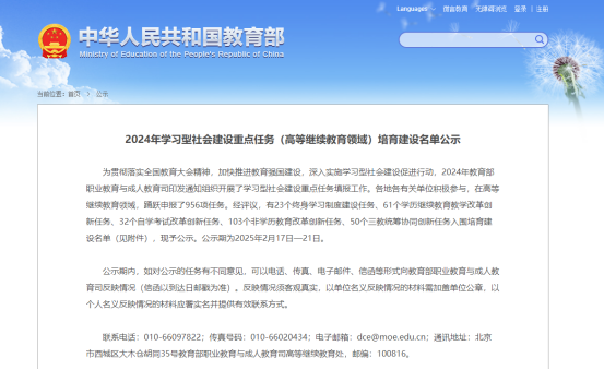 2月17日,教育部职业教育与成人教育司公示2024年学习型社会建设重点任务(高等继续教育领域)培育建设名单,我校2个项目成功入选该榜单,入选项目数位居全国高职院校前列,实现了学校继续教育领域国家级项目立项的重大突破。