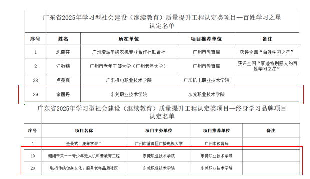 近日,广东省教育厅公布2025年学习型社会建设(继续教育)质量提升工程认定类项目结果,全省共确定“百姓学习之星”42名、“终身学习品牌项目”42个。我校建筑学院余丽丹老师荣获“百姓学习之星”称号,人工智能学院董崇杰老师申报的《翱翔未来——青少年无人机科普教育工程》,体育学院刘淑娴老师申报的《弘扬传统健身文化,服务老年品质社区》项目入选“终身学习品牌项目”。
