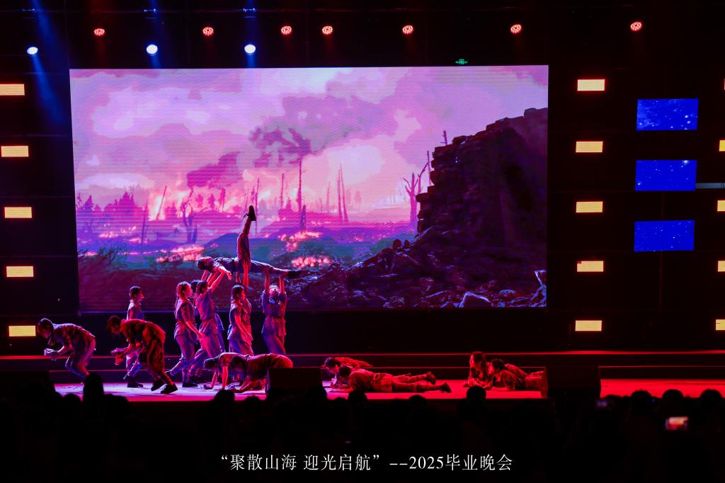 晚会以“聚散山海,迎光启航”为主题,通过管弦乐演奏、歌唱舞蹈表演、模特走秀等精彩纷呈的节目,致敬青春理想,传达母校对2025届毕业生的深切祝福。值得一提的是,今年是纪念中国人民抗日战争暨世界反法西斯战争胜利80周年,临近“七一”中国共产党建党纪念日,街舞社在校团委的指导下编排演绎《四海英雄》,用铿锵有力的青春舞姿再现东江纵队四海而聚的青年,投身抗战的那段波澜壮阔、浴血重生的历史,观毕让人久久不能平静。朗诵《匆匆》回首在校青春岁月,有欢笑、有拼搏、有成长,带着感恩与希望,迈向新征程。合唱《再见》通过深情伤感与青春欢快相结合的情感演绎方式,表达对毕业生的依依惜别与美好祝愿。