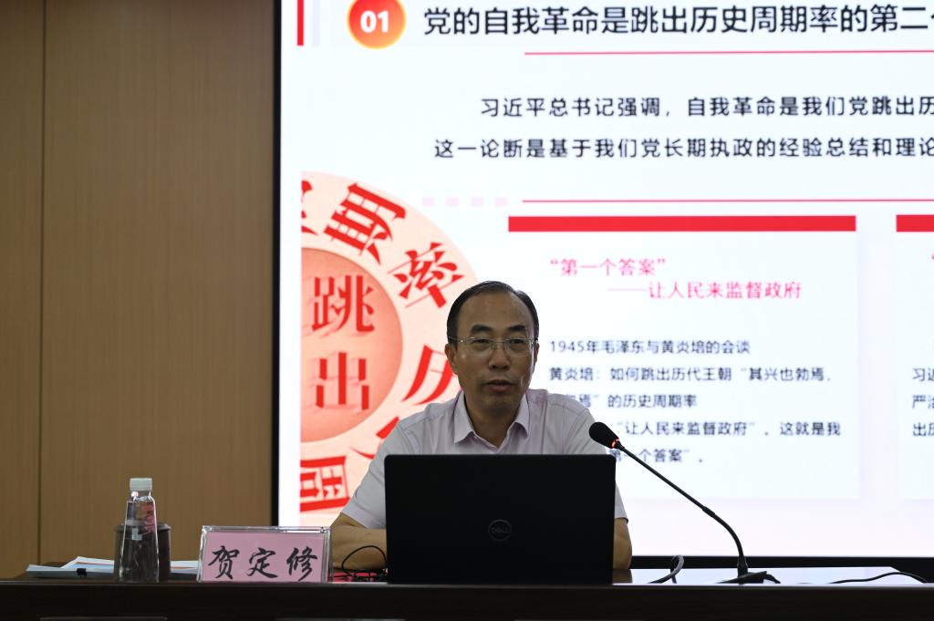 党课最后,贺定修校长号召全体党员干部深入贯彻中央八项规定精神学习教育,一体推进学查改,以优良作风凝心聚力、干事创业,为学校实现更高质量发展提供有力保障。