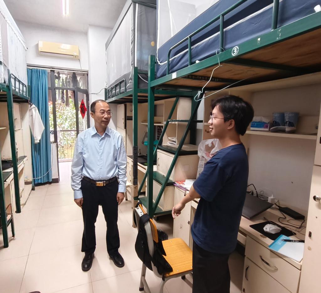 10月29日下午,我校党委副书记、校长贺定修在电子信息学院党总支书记卞建勇、党总支专职副书记高翔的陪同下,深入走访2025级计算机应用技术2班学生宿舍。