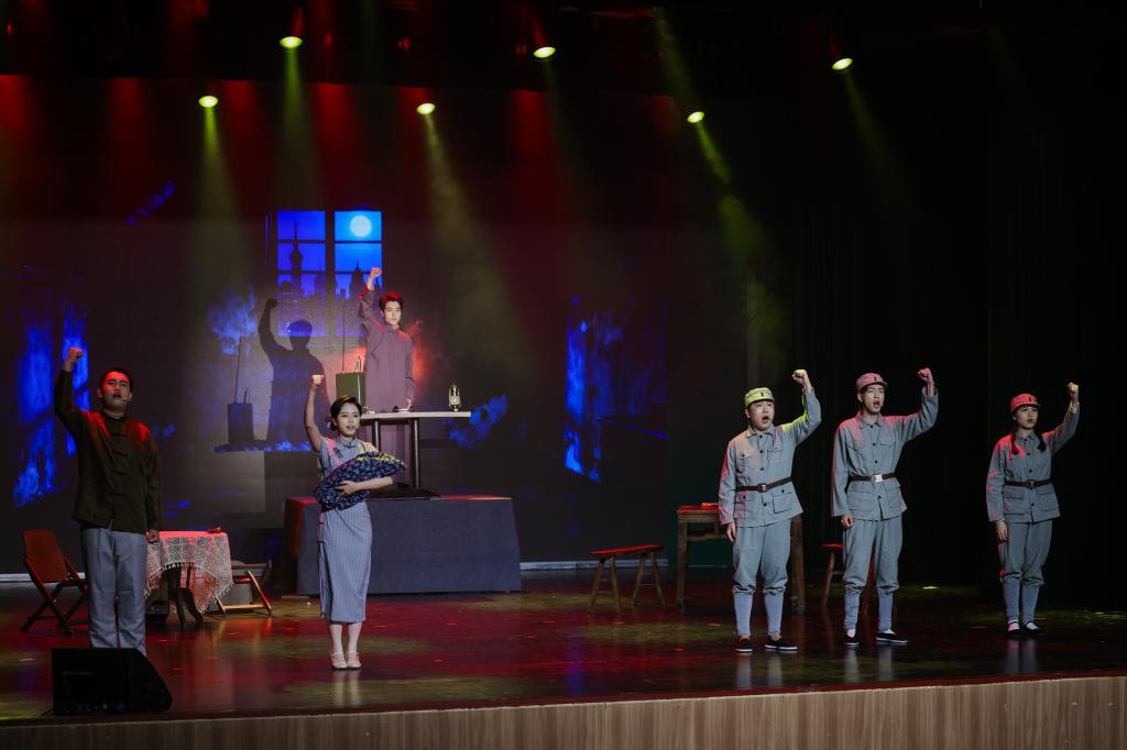 第二篇章“电波不逝 精神永驻”,学生演员们以情景剧《永不消逝的电波》生动还原了隐蔽战线工作者的惊险历程与坚定信仰,再现了革命先辈用生命守护电台、传递情报的感人事迹。