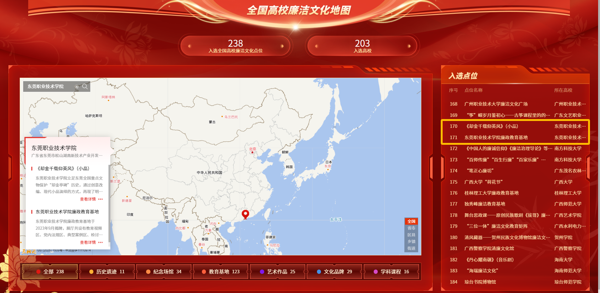 据了解,《清风印迹——全国高校廉洁文化地图》首次整合了全国高校的廉洁文化项目,是推动廉洁教育资源可视化、体系化的重要成果。此次成功入选2个点位,标志着我校深化新时代廉洁文化建设取得了新进展,“廉润东职”廉洁文化品牌建设获得突破性成果,有力推动了廉洁教育融入育人全过程,进一步形成了可复制、可推广的廉洁文化教育“东职模式”。