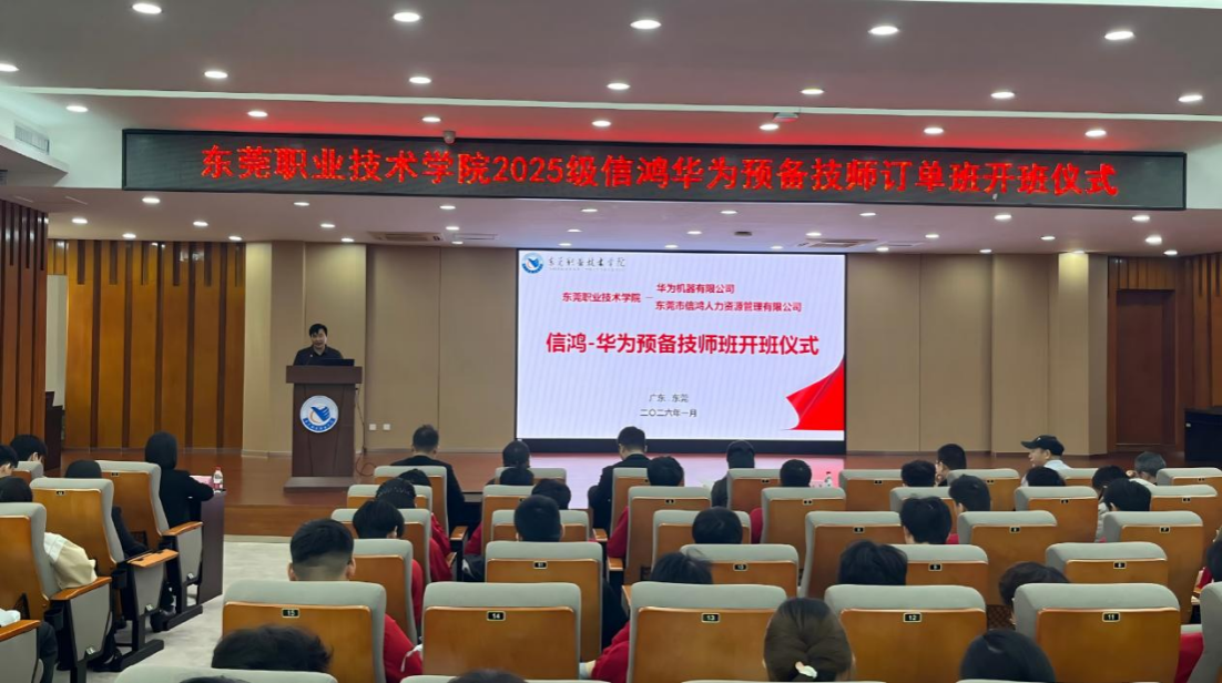 1月16日上午,2025级信鸿-华为预备技师订单班开班仪式在我校立德楼B201举行。我校副院长卞建勇,华为机器有限公司制造技师技工供应管理部袁部长,东莞市信鸿人力资源管理有限公司总经理葛更辉等校企领导出席仪式。华为机器有限公司、东莞市信鸿人力资源管理有限公司相关部门经理及招聘主管,学校产教融合办公室、电子信息学院、智能制造学院等部门负责人及专业教师代表,订单班2025级全体学生参加仪式。