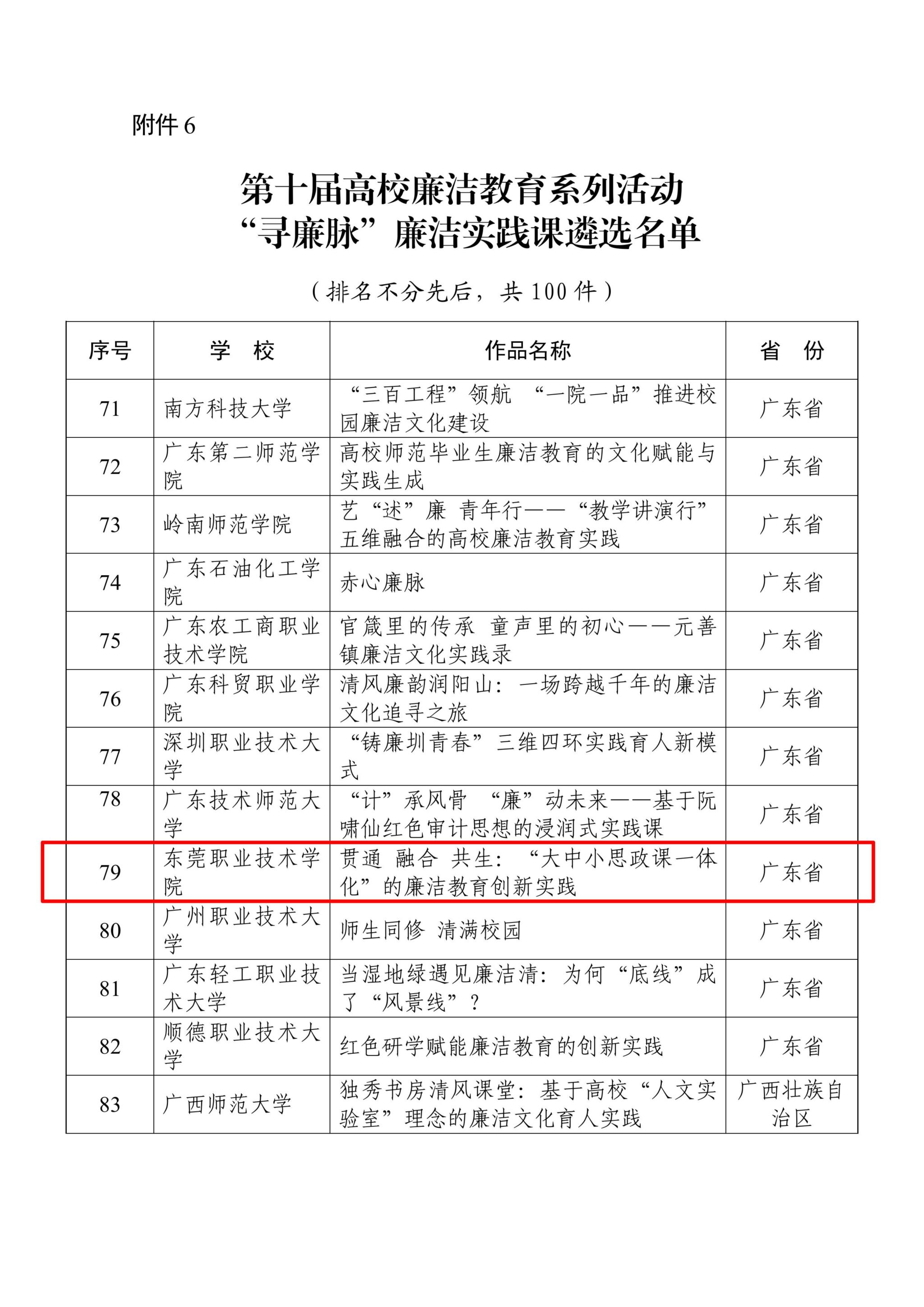 第十届高校廉洁教育系列活动由教育部思想政治工作司主办,面向全国全日制普通高等学校教职工和在校学生开展。我校《致未来的自己——东莞职业技术学院毕业生廉洁文化课》入选廉洁文化课优秀作品(全国100件,广东省7件);《贯通·融合·共生:“大中小思政课一体化”的廉洁教育创新实践》入选廉洁实践课优秀作品(全国100件,广东省12件);廉政教育基地、小品《却金千载仰英风》2件作品入选廉洁文化地图素材(全国242件,广东省13件)。这是我校将廉洁教育融入育人全过程的实践成果,有力推动进一步形成可复制、可推广的廉洁文化教育“东职模式”。