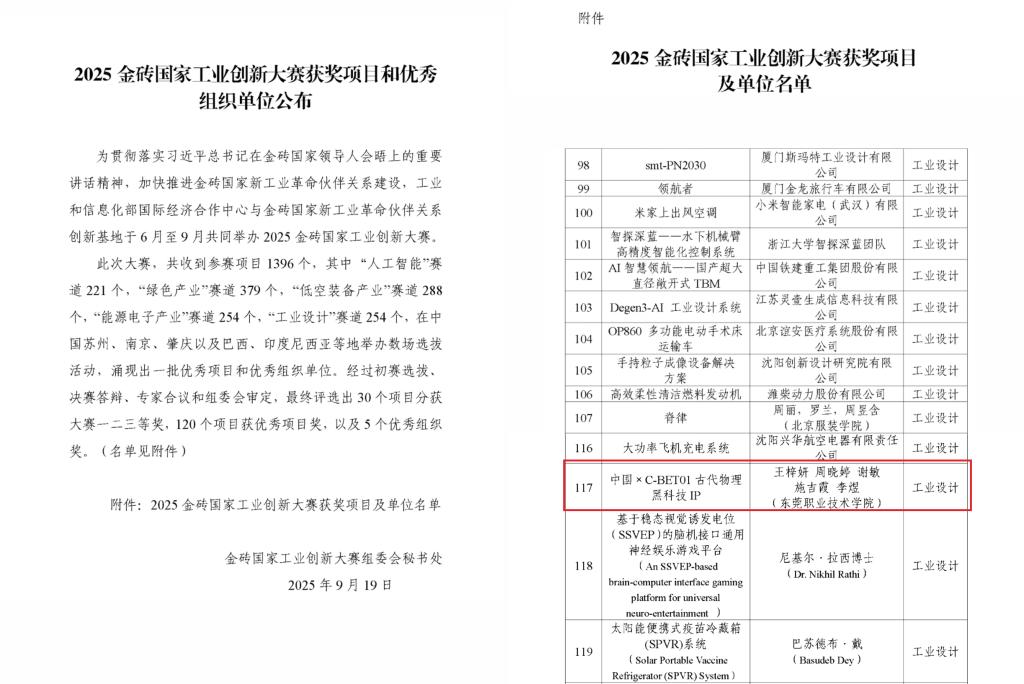 我校创意设计与传媒学院教师陈惠华、易熙琼指导的《中国xC-BET01古代物理黑科技IP》项目(团队成员:王梓妍、周晓婷、谢敏、施吉霞、李煜)在本次国际总决赛中摘得优秀项目奖,是“工业设计”赛道中“文化传承与产业创新设计”赛项的唯一获奖项目,展现了我校学子的卓越创新能力与跨学科合作精神。本次大赛的经历不仅是一份荣誉,更是一次能力的全面提升和视野的巨大开拓。学生团队表示,将继续深耕项目,希望未来能将方案真正落地应用,为工业创新与文化传承贡献一份青春力量。