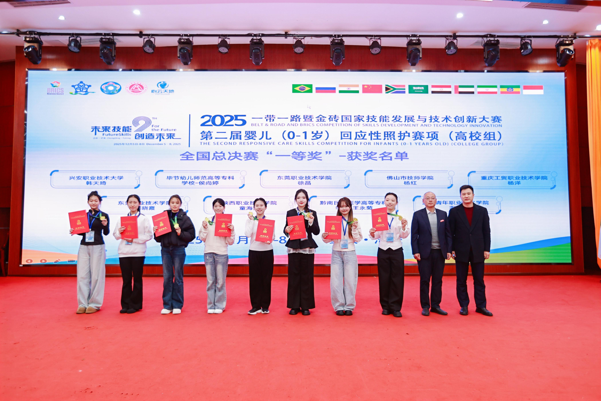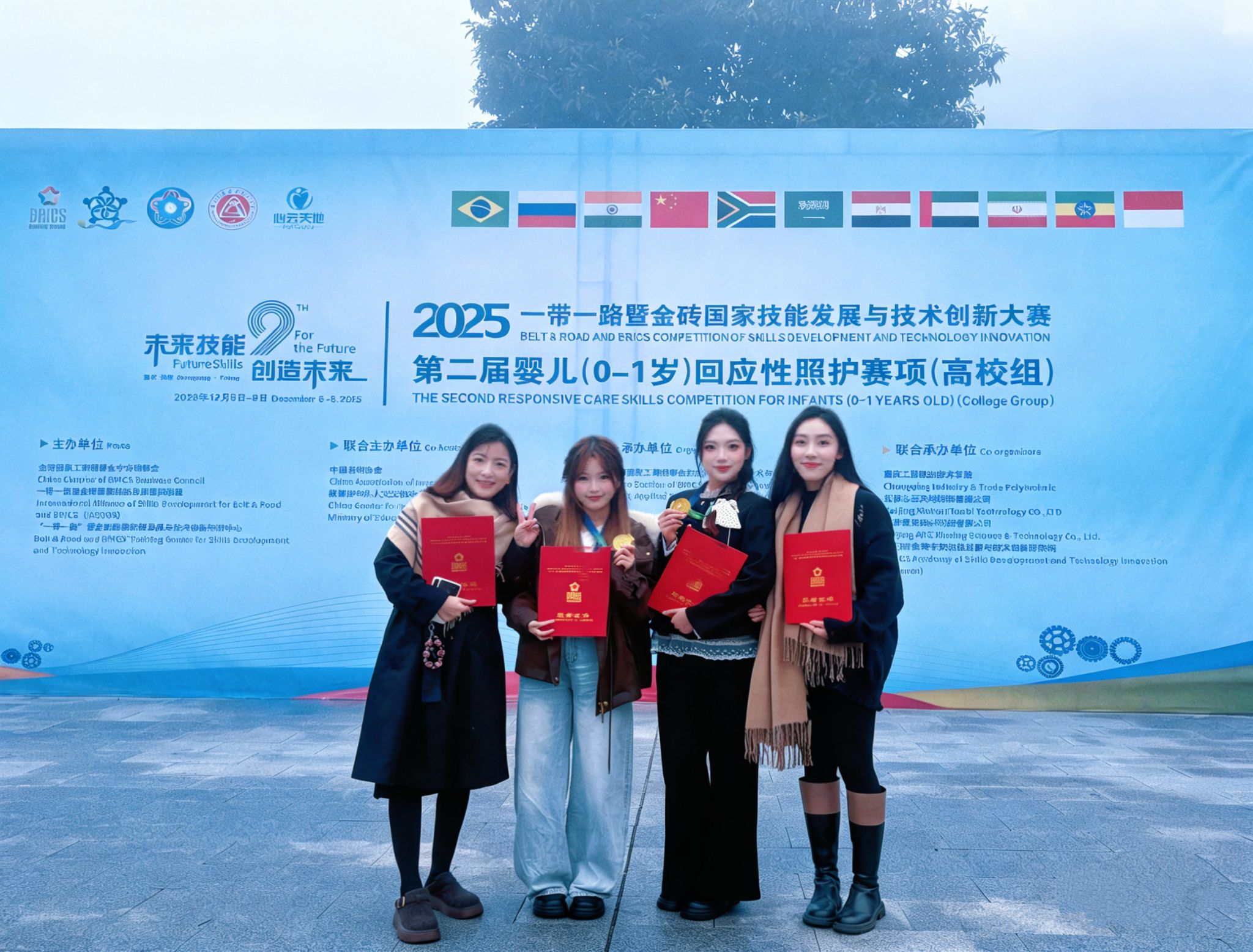 近日,2025“一带一路”暨金砖国家技能发展与技术创新大赛之第二届婴儿(0-1岁)回应性照护赛项(高校组)全国总决赛在重庆涪陵圆满落幕。经过为期四天(12月5日至8日)的激烈角逐,我校选派的徐晶、郭晓霞同学,凭借扎实的理论功底、精湛的实操技能和卓越的综合素养,荣获本赛项最高荣誉——全国总决赛一等奖,充分展现了我校学前教育专业优秀的教学质量。